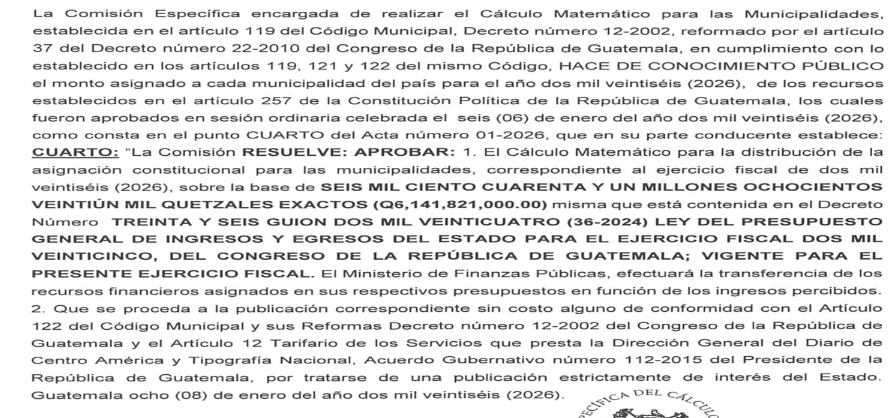 CÁLCULO MATEMÁTICO PARA LA DISTRIBUCIÓN DE LA ASIGNACIÓN CONSTITUCIONAL A LAS 340 MUNICIPALIDADES DEL PAÍS PARA EL AÑO 2026