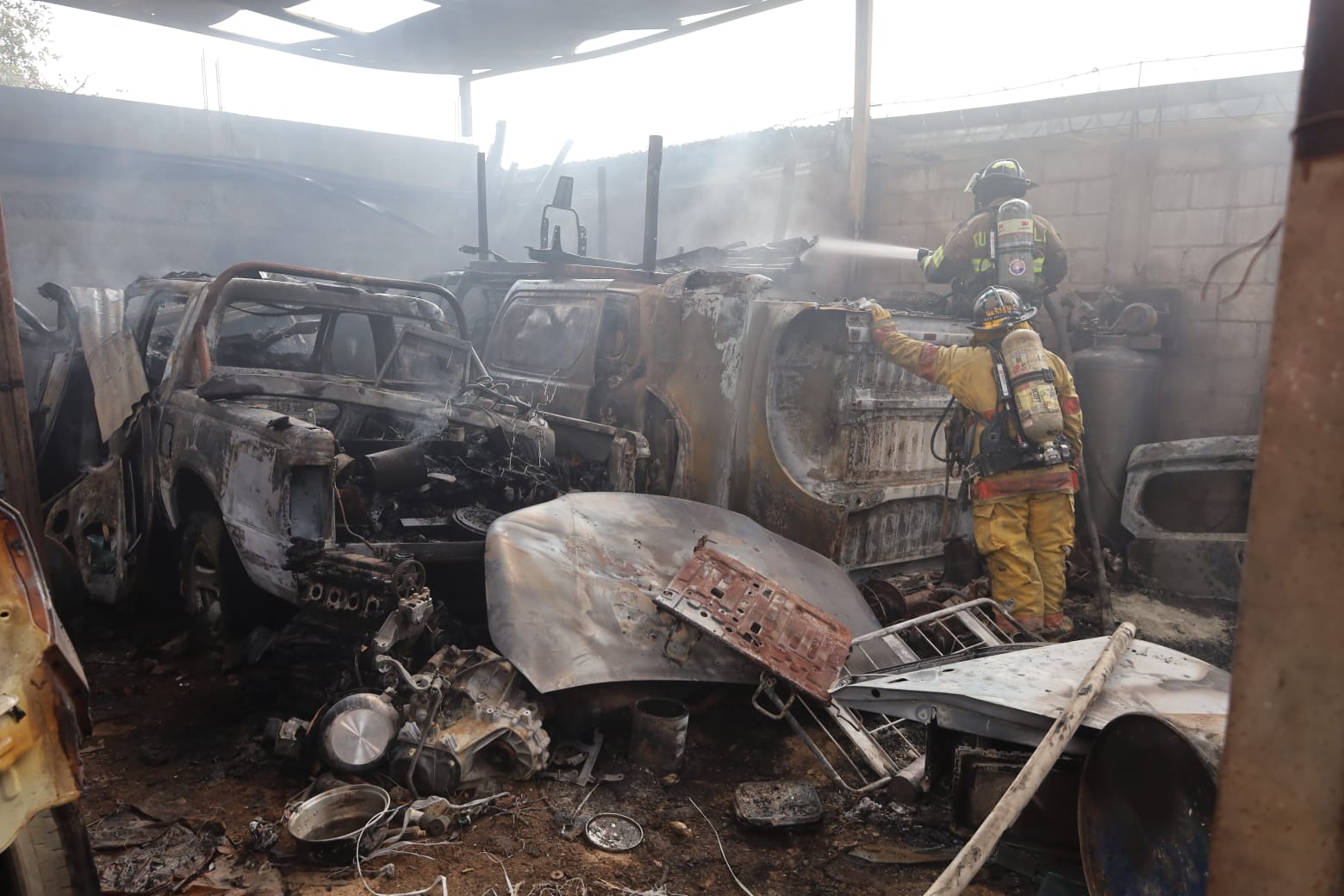 Bomberos Voluntarios controlan un incendio en un taller de enderezado y pintura en la zona 2 de Villa Nueva, donde varios vehículos resultan dañados.