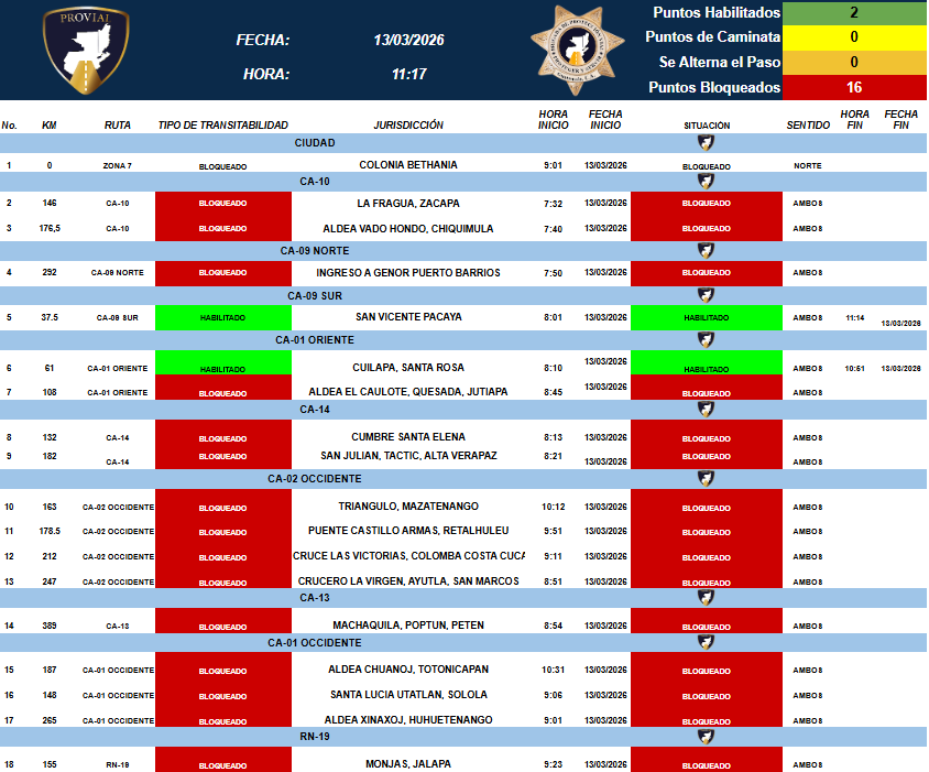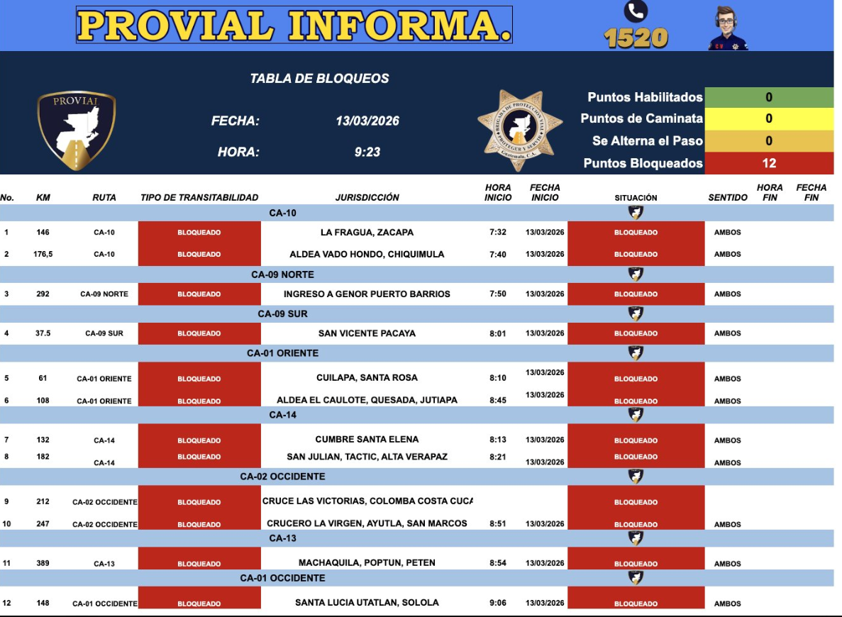 Provial informa que se reporta un incremento en los puntos bloqueados en distintas rutas del país, registrándose 12 bloqueos hasta el momento.