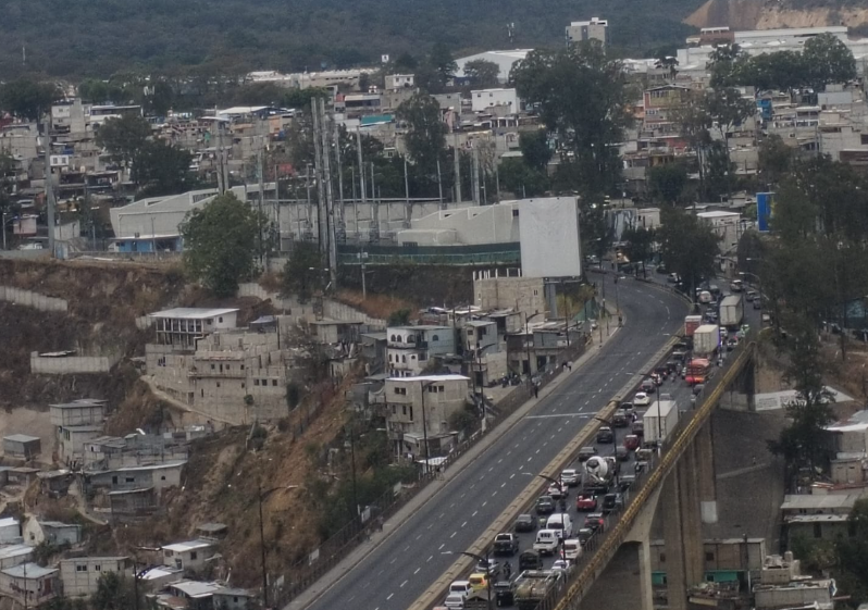 Fila de vehículos hacia la ciudad PMT Villa Nueva la reporta en el km. 14 ruta CA-9 no reportan obstáculos en la vía pública.