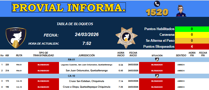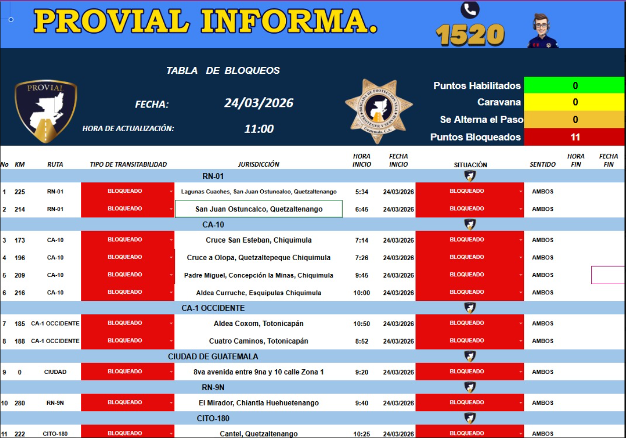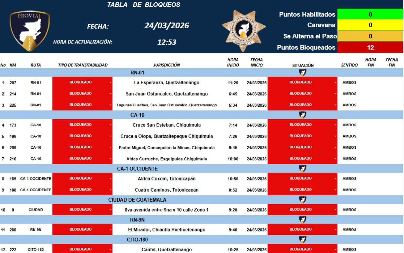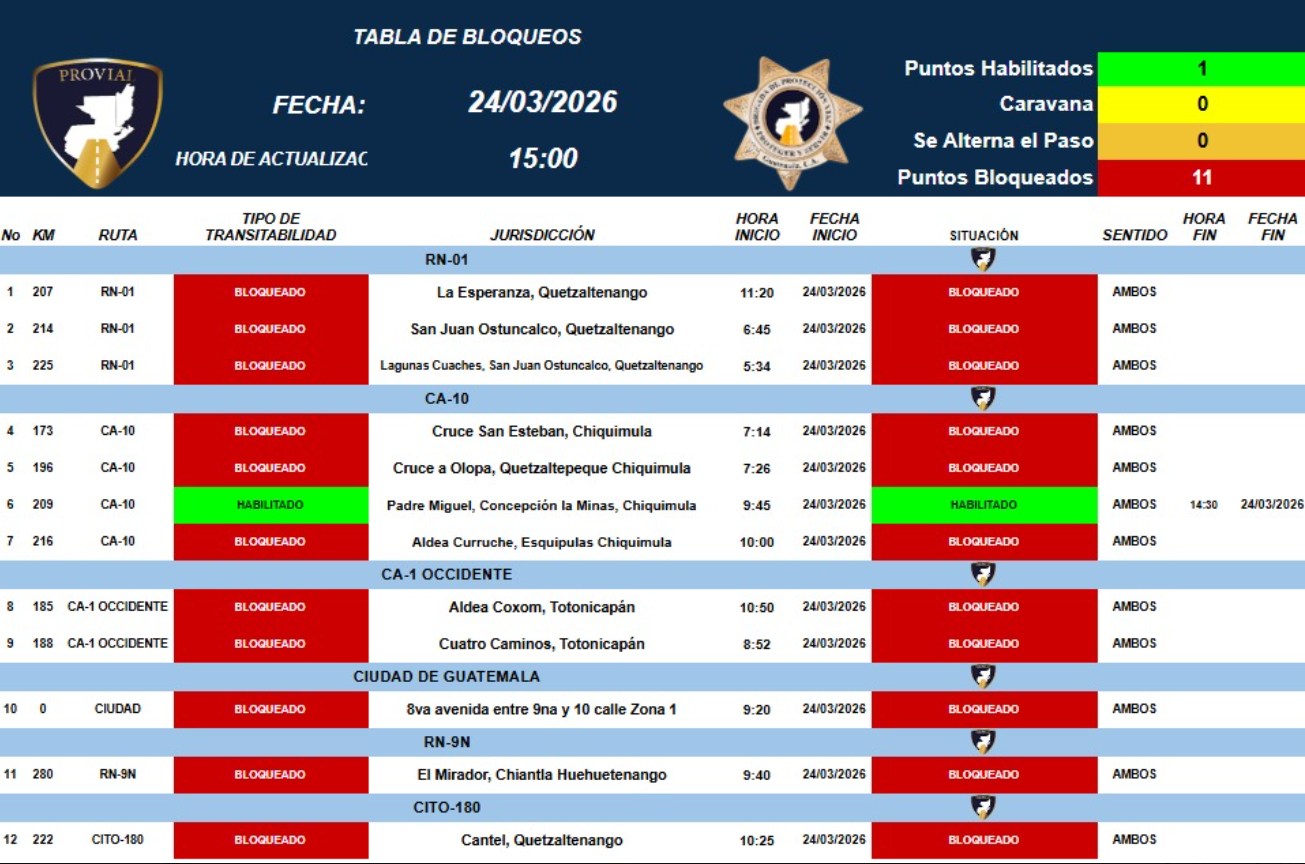 Ocho bloqueos en Quetzaltenango, Chiquimula, Totonicapán, Huehuetenango y Guatemala reporta PROVIAL en su monitoreo a las 09:50 horas.