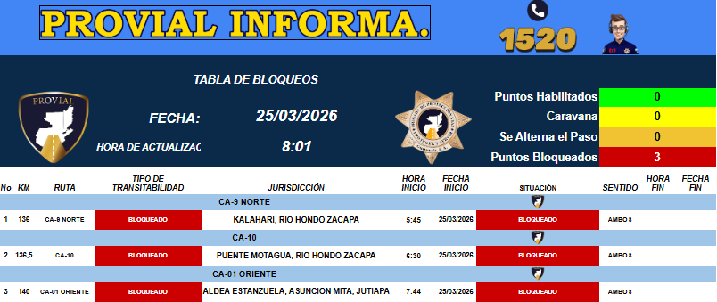 Provial reporta la interrupción del tránsito en el kilómetro 140 de la ruta a El Salvador, en Asunción Mita, Jutiapa.