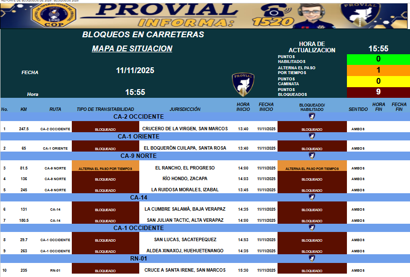 Provial reporta que los primeros bloqueos se registran en el kilómetro 65 de la ruta a El Salvador, en el km 247 de la ruta al suroccidente y en el km 245 de la ruta al Atlántico.