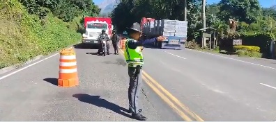 Brigadas de Provial en puesto de regulación vehicular por socavamiento sobre el km. 194 de ruta CITO-180 (Aldea Calahuache, El Palmar, Quetzaltenango). Alternan la vía por lapsos de tiempo.
