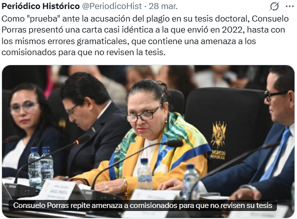 La fiscal general Consuelo Porras volvió a generar polémica al reiterar una advertencia dirigida a los comisionados encargados del proceso, instándolos a abstenerse de revisar su tesis académica, señalada de presunto plagio.